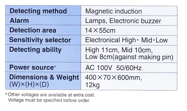 • Detecting sensitivity is switchable according to sizes, kinds, quantities of wearing accessories which enhances detecting ability in lady’s and gentleman’s apparel.