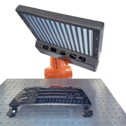 Sensor deflectometry kompak dipandu di atas objek pengukuran oleh robot. Sensor memungkinkan pemeriksaan benda yang geometrinya membutuhkan beberapa posisi pengukuran. Cacat yang ditemukan dievaluasi dan ditampilkan dalam model 3D.